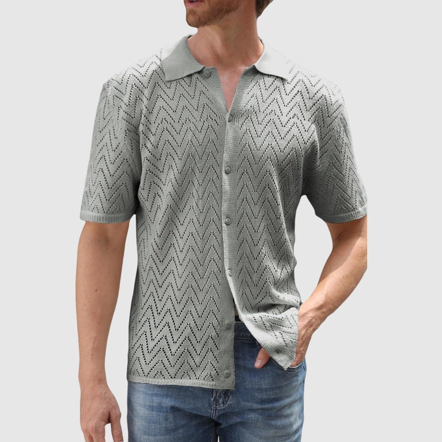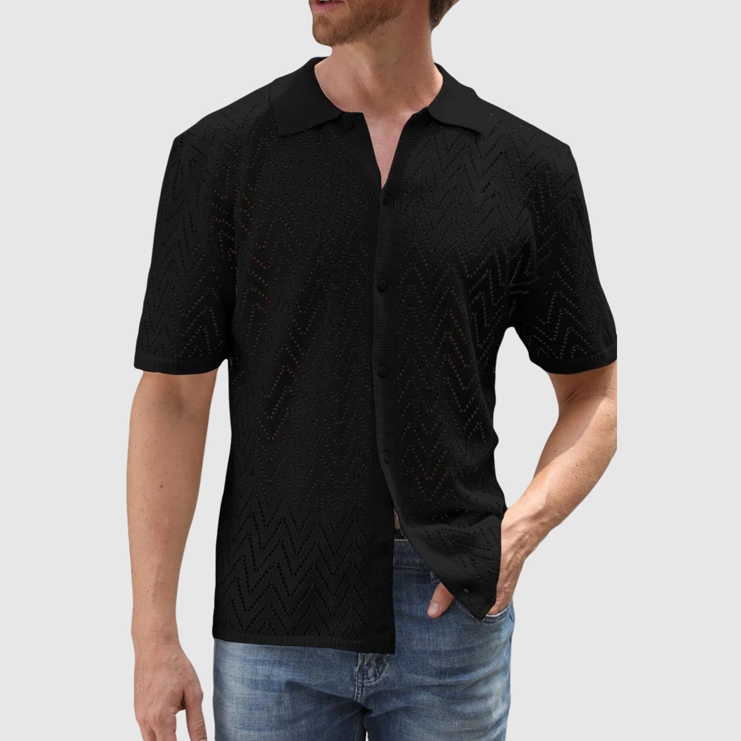Usudite se nositi odjeću koja spaja svježinu, teksturu i suvremeni stil. Ova pletena košila s cik-cak uzorkom dodaje suvremen i sofisticiran dodir, a da pritom ne odustaje od udobnosti. Zbog lagane i prozračne tkanine idealna je za svaku neformalnu prigodu ili ljetni događaj.